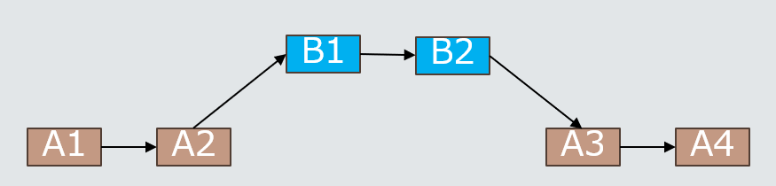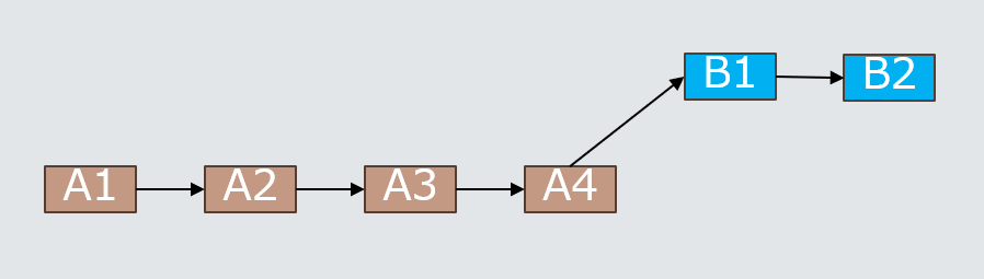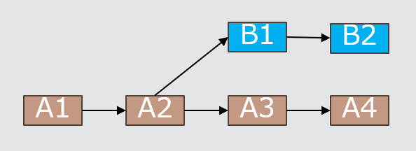 다음과 같이 A라는 Master에서 B라는 Branch를 생성해서 작업했다고 가정합니다.