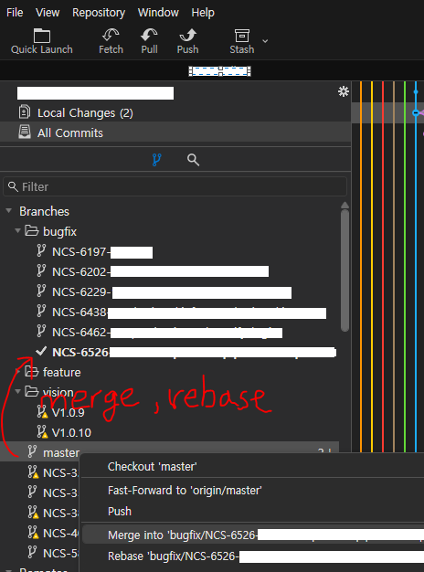 만약 프로젝트 히스토리를 그대로 유지한 상태로 브랜치를 합치고 싶다면, 'Merge'를 사용하세요.