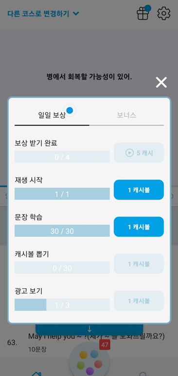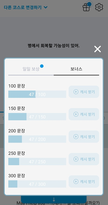 이렇게 100문장에 대한 보상을 획득하다보면 약 5회정도 광고를 봐야 하는 거 같아요. 그럼 총 120원정도가 쌓이게 됩니다. 여기에 추가로 윗의 선물모양의 버튼을 클릭하면 일일보상과 보너스 탭이 보입니다.