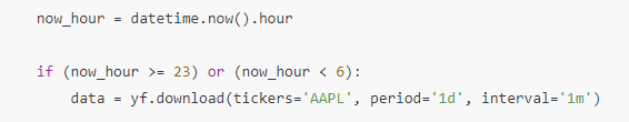 - 위의 부분은 미국 주식 시장이 열린 23시부터 다음날 06시 이전에만 체크하도록 하려고 넣은 코드입니다.