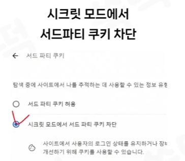 구글 최신버전에서는 다음과 같이 설정이 없어졌을 수도 있어요. 시크릿 모드에서는 무조건 쿠키 차단되도록...