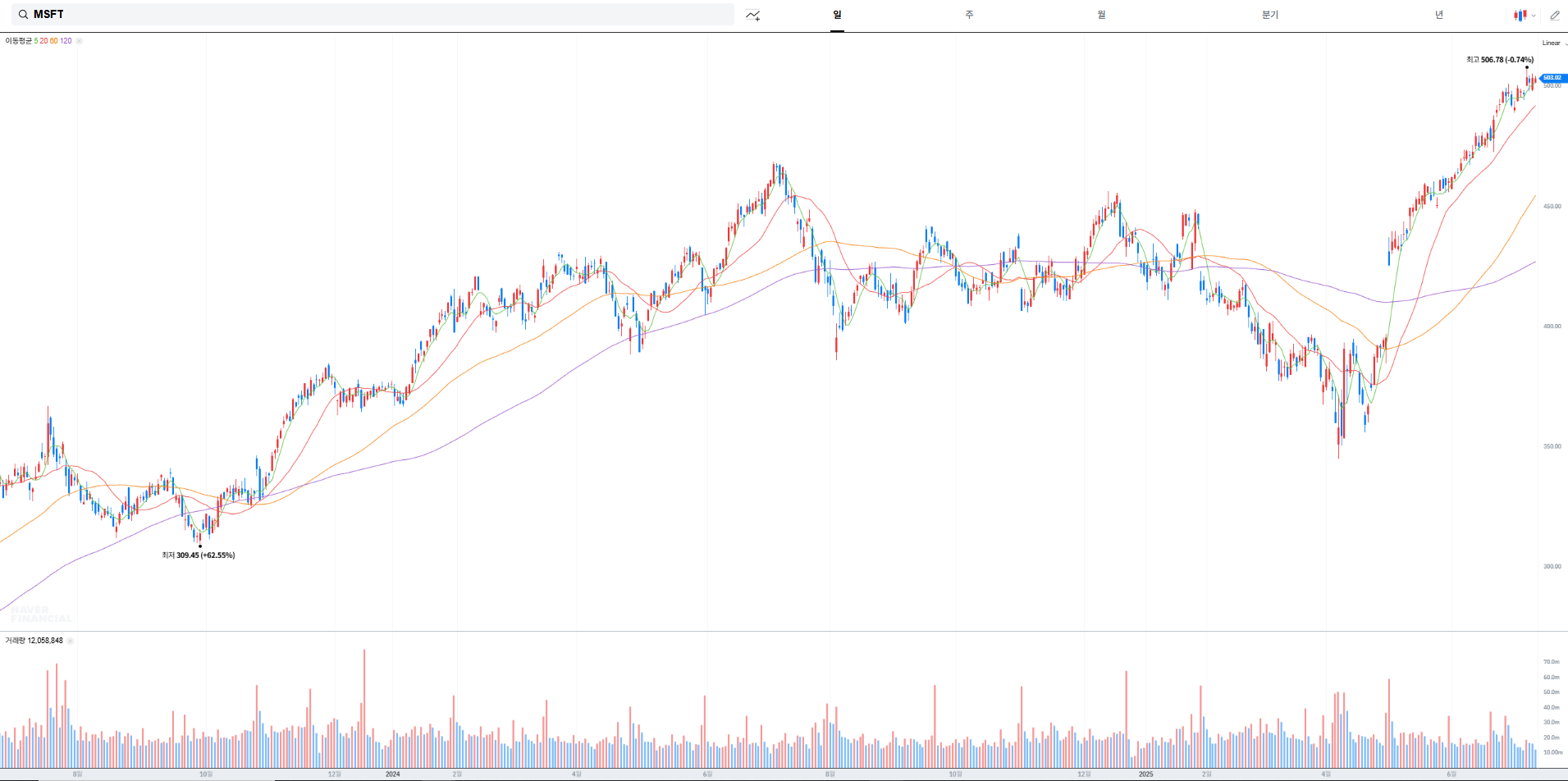 마이크로소프트의 주식은 최근 몇 년 동안 지속적인 상승세를 보였습니다. 2020년부터 2025년까지의 주가 추세를 살펴보면, 큰 변동이 있었지만, 전체적으로 안정적인 상승세를 유지하고 있습니다. 현재 주가는 503.02 달러로, 많은 투자자들이 긍정적인 전망을 가지고 있습니다.