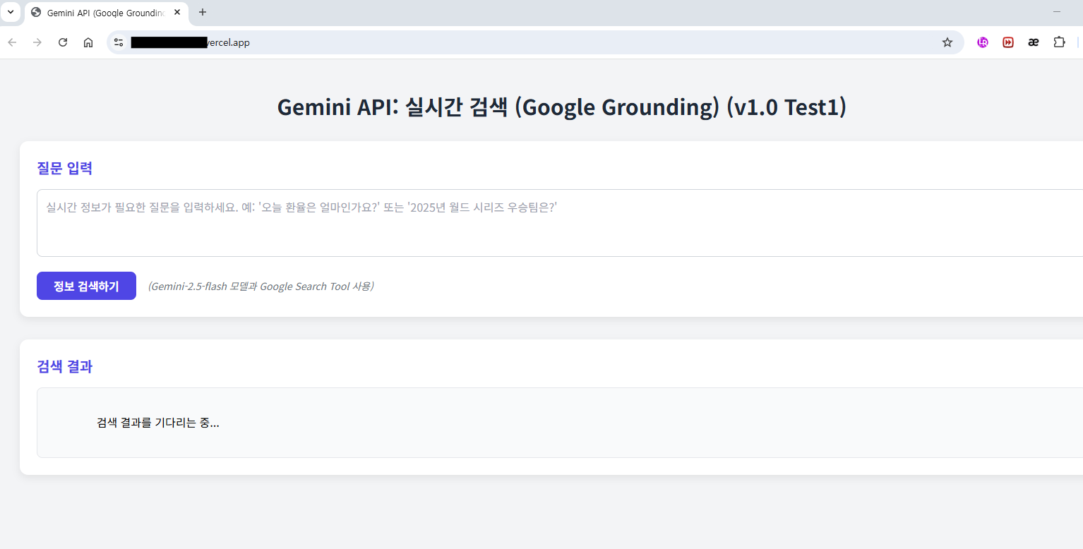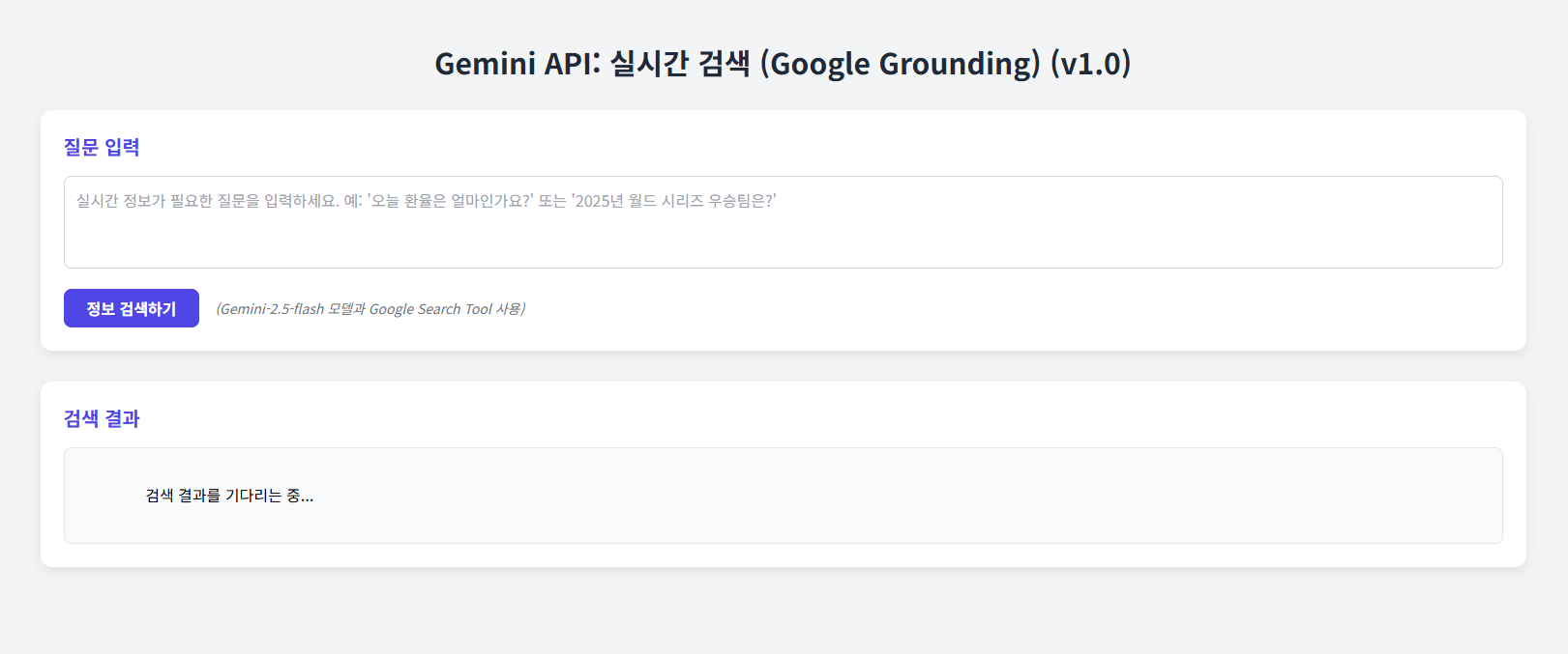 요즘엔 AI를 이용하여 개발하기 쉽죠. 저는 Python코드에서 Google Gemini를 이용하여 문의를 하고 답변을 받는 API를 사용한 일이 있었는데, 이때 '현재 시점의 데이터를 검색하여 그 기반으로 답변해줘.' 라고 했더니 엔진이 학습된 시점(약 1년전)의 데이터를 답변에 적어주더라고요. 그래서 검색하다가 'Google Grounding' 을 사용하면 된다는 것을 찾았습니다. 그리고 Gemini에 'Google Grounding' 을 이용하여 질문을 하고 답변을 받는 페이지를 만들어줘라고 하니, html 소스코드를 만들어줬어요.이걸 github에 올렸죠. index.html 페이지입니다. 로컬에서 실행하면 이런게 나오는 페이지입니다.