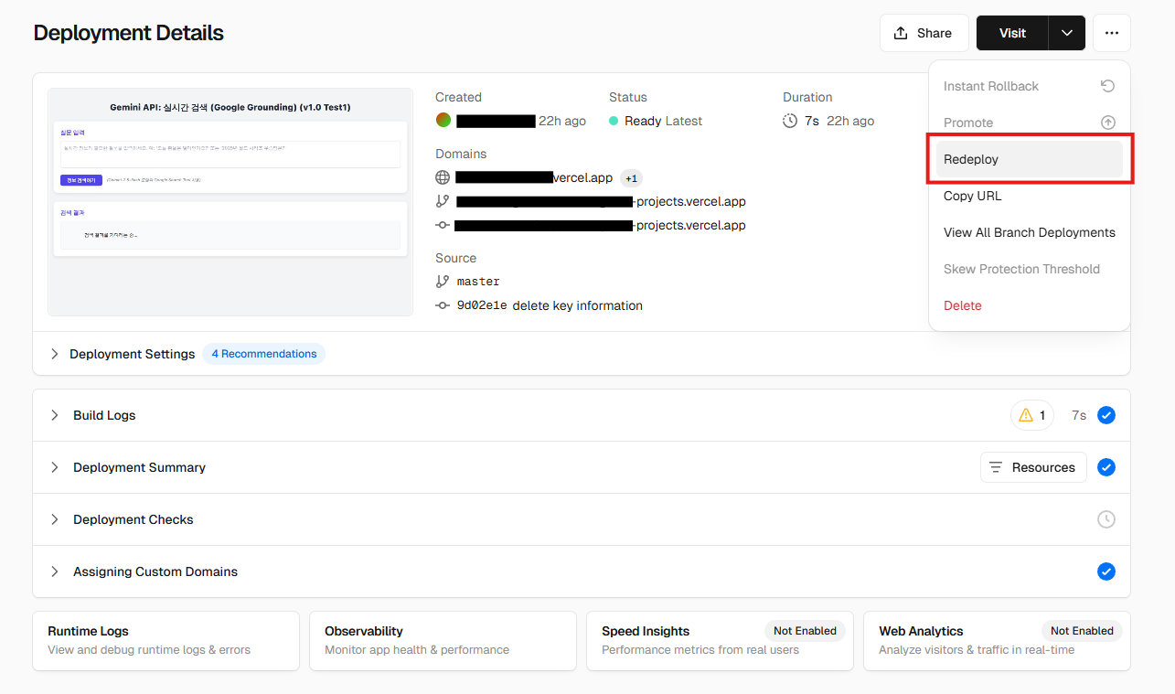 역기서 화면 우측 상단의 ... 에서 Deploy, 다음부터는 Redeply 라고 되어 있는 버튼을 클릭하면 됩니다.