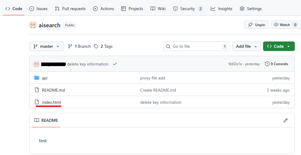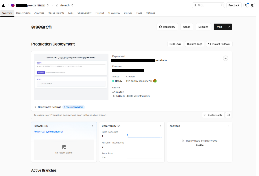 저는 master에 올려서 진행햅니다. git에 대한 기능은 여기서 다루지 않겠습니다. 프로젝트 이름은 aisearch라고 이름 지었어요.