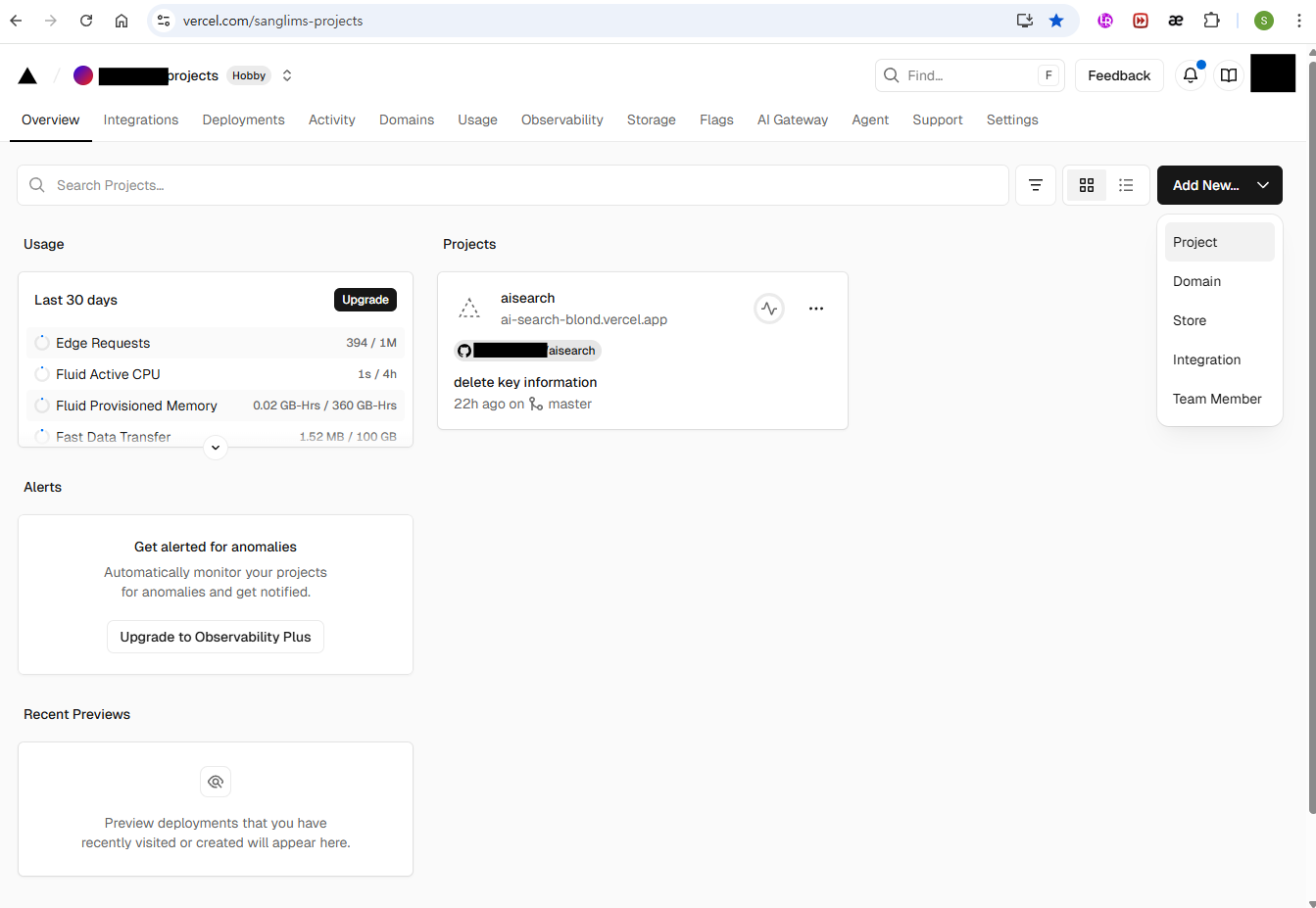 이렇게 가입하고 여기서도 우측 상단쯤에 있는 Add New 의 Project를 눌러서 생성하고 GitHub의 프로젝트를 선택하니 다음과 같이 보입니다.